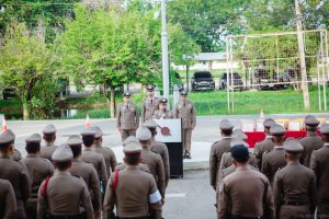 เวลา 08.00 น. ร่วมเคารพธงชาติ, สวดมนต์ไหว้พระ, กล่าวอุดมคติตำรวจ, ปฏิญาณตน และ อ่านสารของ ผบ.ตร.