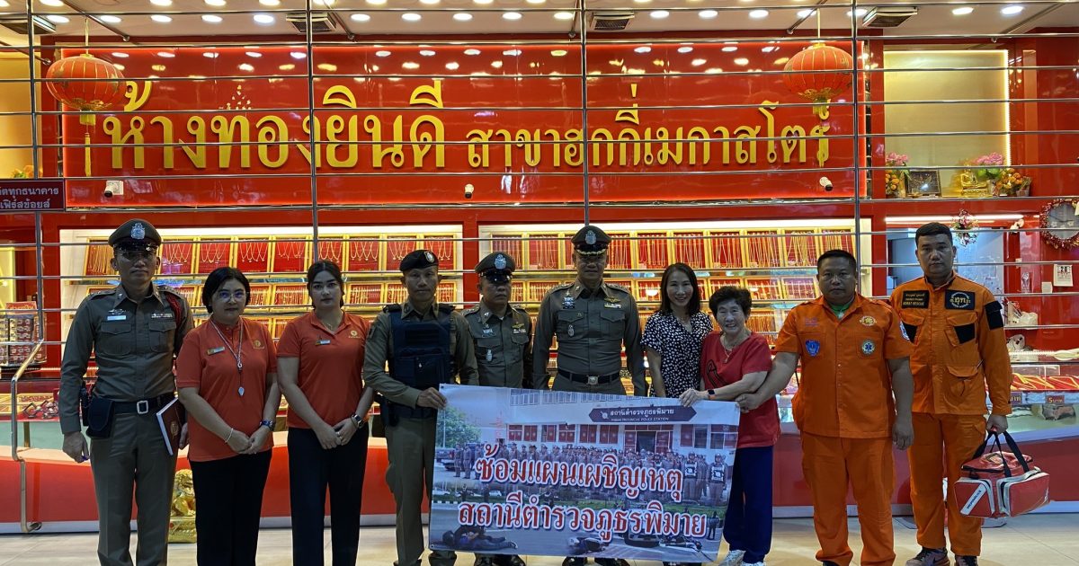 วันที่ 28 มกราคม พ.ศ. 2569 เวลา 13.30 น. พ.ต.อ.ถึงพร ปานทอง ผกก.สภ.พิมาย, พ.ต.ท.ประเสริฐ ฟุ้งพิมาย รอง ผกก.ป.สภ.พิมาย, พ.ต.ท.วิทยา บุญวัน รอง ผกก.(สอบสวน)สภ.พิมาย, พ.ต.ท.ภครัช สายสมบูรณ์ รอง ผกก.สส.สภ.พิมาย, พ.ต.ท.พิทยา การสร้าง สวป.สภ.พิมาย, พ.ต.ต.สมสอาด จันทีนอก สว.สส.สภ.พิมาย พร้อมด้วยเจ้าหน้าที่สายตรวจรถยนต์/รถจักรยานยนต์, สายตรวจตำบล, สายตรวจจราจร, เจ้าหน้าที่ชุดสืบสวน และเจ้าหน้าที่งานสอบสวน สภ.พิมาย ร่วมซักซ้อมแผนเผชิญเหตุวิ่งราวทรัพย์สร้อยข้อมือทองคำ โดยได้จำลองเหตุการณ์ว่ามีคนร้ายทำทีจะมาซื้อทอง แล้วฉวยโอกาสชิงทองหลบหนีไป โดยใช้รถจักรยานยนต์เป็นยานพาหนะ ณ ร้านทองยินดี สาขาฮกกี่ เมกาสโตร์ หมู่ที่ 3 ต.กระเบื้องใหญ่ อ.พิมาย จ.นครราชสีมา