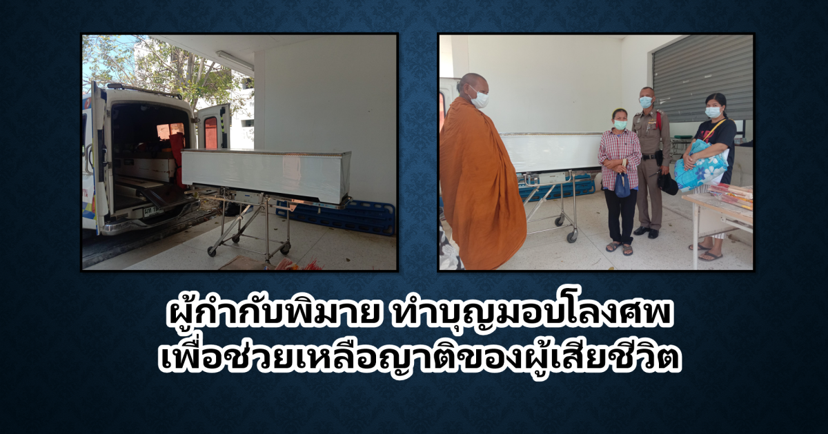 วันที่ 26 กุมภาพันธ์ 2566 เวลา 13.00 น. พ.ต.อ.สิทธิศักดิ์ พรหมหมื่นไวย ผกก.สภ.พิมาย มอบหมายให้ ร.ต.อ.พิเชษฐ์ ฉวีกลาง รอง สวป.สภ.พิมาย นำโลงศพมาบริจาคให้แก่ญาติของผู้เสียชีวิต ณ โรงพยาบาลพิมาย อ.พิมาย จ.นครราชสีมา เพื่อเป็นการร่วมทำบุญและช่วยเหลือญาติของผู้เสียชีวิต ซึ่ง ผกก.สภ.พิมาย ได้จัดทำโครงการบริจาคโลงศพให้แก่ศพไร้ญาติ, ครอบครัวผู้ยากไร้ และผู้ที่ประสบปัญหาเรื่องค่าใช้จ่ายในการประกอบพิธีฌาปนกิจศพ โดยใช้งบประมาณส่วนตัวในการจัดซื้อโลงศพดังกล่าว