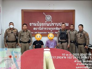 วันที่ 10 เมษายน พ.ศ. 2568 ภายใต้การอำนวยการ พ.ต.อ.สิทธิศักดิ์ พรหมหมื่นไวย ผกก.สภ.พิมาย มอบหมายให้ พ.ต.ท.ประเสริฐ ฟุ้งพิมาย รอง ผกก.ป.สภ.พิมาย, พ.ต.ต.พิทยา การสร้าง สวป.สภ.พิมาย, ร.ต.อ.อำนาจ มาสันเทียะ รอง สว.ธร.สภ.พิมาย ปฏิบัติหน้าที่ร้อยเวรป้องกันปราบปราม พร้อมด้วยเจ้าหน้าที่สายตรวจรถยนต์/รถจักรยานยนต์ ออกตรวจตราเพื่อป้องกันปราบปรามอาชญากรรมในพื้นที่ สามารถจับกุมผู้กระทำความผิด ดังนี้