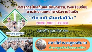 วันที่ 1 กุมภาพันธ์ พ.ศ. 2568 นายศิวะเสก สินโทรัมย์ นายอำเภอพิมาย, พ.ต.อ.สิทธิศักดิ์ พรหมหมื่นไวย ผกก.สภ.พิมาย, พ.ต.ท.ประเสริฐ ฟุ้งพิมาย รอง ผกก.ป.ฯ, พ.ต.ท.ไพบูรณ์ คูณค้ำ รอง ผกก.สส.ฯ, พ.ต.ท.สุวกฤษฎิ์ พิมพ์จันทร์ สว.สส.ฯ, พ.ต.ต.พิทยา การสร้าง สวป.ฯ, พ.ต.ต.พิสาร ทองสมุทร สวป.(ชส.)ฯ พร้อมด้วยเจ้าหน้าที่ตำรวจ สภ.พิมาย ร่วมกับเจ้าหน้าที่ฝ่ายปกครองอำเภอพิมาย, อส.ตร., อปพร. และอาสาสมัครกู้ชีพกู้ภัยอำเภอพิมาย ร่วมดำเนินการตามมาตรการการรักษาความสงบเรียบร้อยงานแสดงดนตรี “พิมายมิวสิค เฟสติวัล” ดังนี้