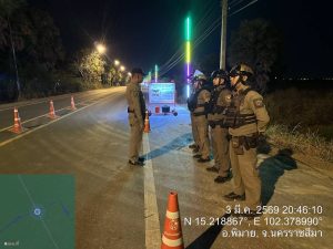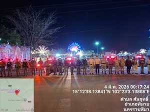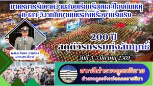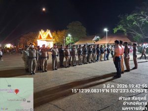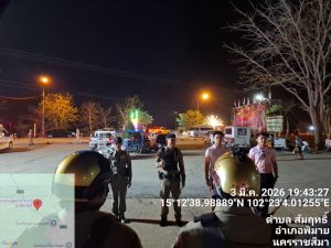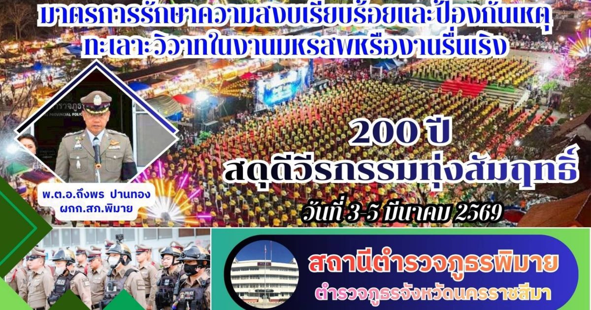 วันที่ 3 มีนาคม พ.ศ. 2569 พ.ต.อ.ถึงพร ปานทอง ผกก.สภ.พิมาย มอบหมายให้ พ.ต.ท.ประเสริฐ ฟุ้งพิมาย รอง ผกก.ป.ฯ, พ.ต.ท.พิทยา การสร้าง สวป.ฯ, พ.ต.ท.พิสาร ทองสมุทร สวป.(ชส.)ฯ, พร้อมด้วยเจ้าหน้าที่ตำรวจ สภ.พิมาย ร่วมกับเจ้าหน้าที่ฝ่ายปกครองอำเภอพิมาย, อส.ตร., อปพร. และอาสาสมัครกู้ชีพกู้ภัยอำเภอพิมาย ร่วมดำเนินการตามมาตรการการรักษาความสงบเรียบร้อยงาน “200 ปี สดุดีวีรกรรมทุ่งสัมฤทธิ์” ดังนี้