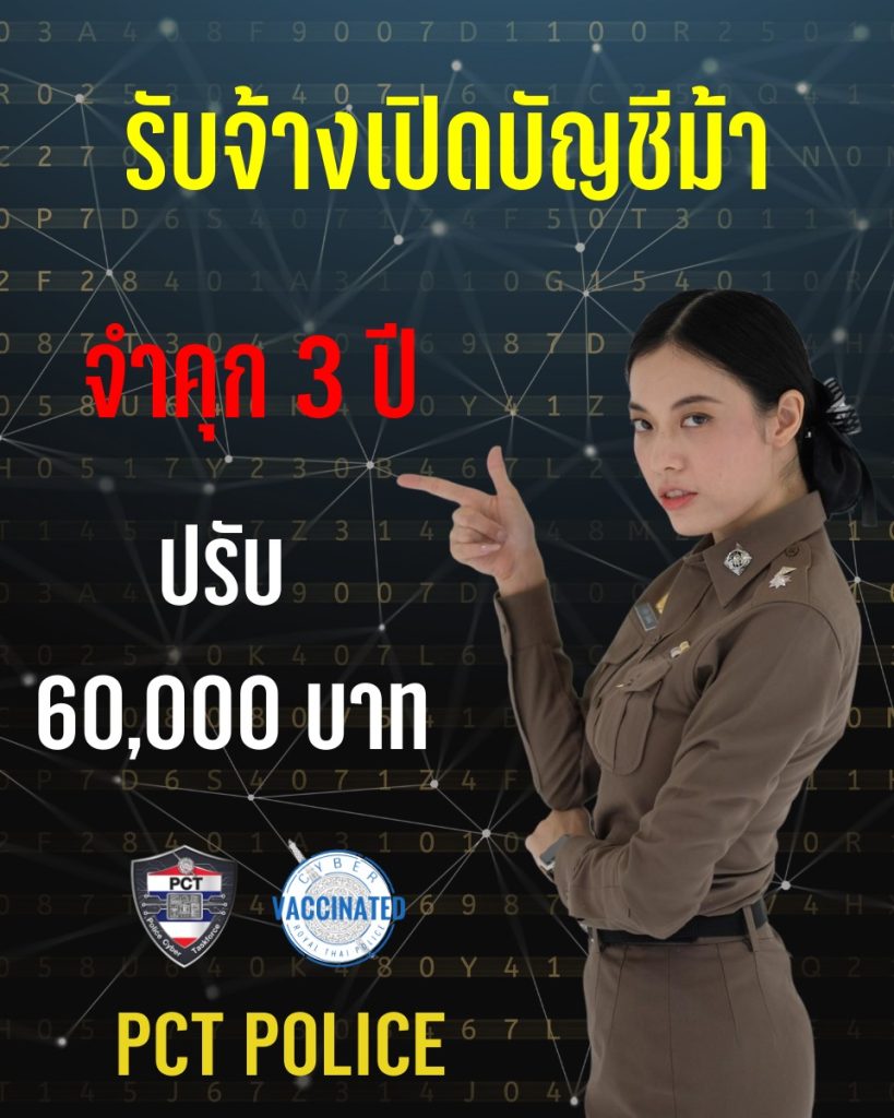 พวกเราตำรวจ PCT จะเอาผิดกับพวกเหล่ารับเปิดบัญชีม้าอย่างจริงจัง ขอให้ทุกๆคนช่วยกันแชร์ให้คนใกล้ตัวได้รู้ว่า ที่คิดจะเปิดบัญชีม้าเพื่อเงินน้อยนิดนั้น ได้ไม่คุ้มเสียอย่างแน่นอน