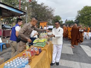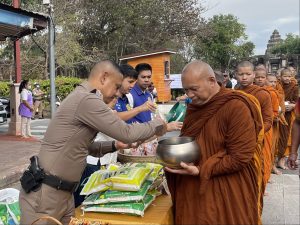 วันที่ 12 ธันวาคม พ.ศ. 2568 เวลา 08.30 น. พ.ต.อ.ถึงพร ปานทอง ผกก.สภ.พิมาย, พ.ต.ท.พิสาร ทองสมุทร สวป.(ชส.)สภ.พิมาย, ร.ต.อ.สังวาลย์ สกุลฤทธิสิงห์ รอง สว.จร.สภ.พิมาย พร้อมด้วยเจ้าหน้าที่ตำรวจ สภ.พิมาย ร่วมกิจกรรมน้ำใจชาวอำเภอพิมาย เพื่อแผ่นดินไทย ทำบุญตักบาตรข้าวสาร/ อาหารแห้ง/อาหารสำเร็จรูป แก่พระสงฆ์ จำนวน 30 รูป เพื่อช่วยเหลือผู้ประสบภัยจากเหตุการณ์ปะทะชายแดนไทย-กัมพูชา มอบให้ศูนย์อพยพและทหาร โดยมี นายศิวะเสก สินโทรัมย์ นายอำเภอพิมาย, หัวหน้าส่วนราชการ, ผู้บริหารท้องถิ่น, กำนัน/ผู้ใหญ่บ้าน และประชาชนชาวอำเภอพิมายร่วมพิธี ณ บริเวณถนนจอมสุดาเสด็จ หน้าอุทยานประวัติศาสตร์พิมาย ต.ในเมือง อ.พิมาย จ.นครราชสีมา