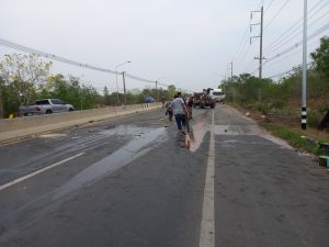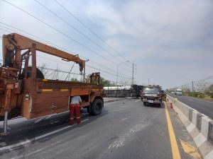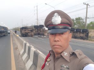 วันที่ 21 มีนาคม พ.ศ. 2568 เวลา 07.00 น. ร.ต.อ.เนติโรจน์ ปิยะภิรมย์ชัย รอง สว.(สอบสวน)สภ.พิมาย, ร.ต.อ.สุพรรณโรจน์ อิ่มวิเศษ รอง สวป.สภ.พิมาย (ปฏิบัติหน้าที่ร้อยเวรจราจร) พร้อมด้วยสายตรวจจราจรและเจ้าหน้าที่กู้ภัย ร่วมตรวจสอบอุบัติเหตุรถยนต์บรรทุกพ่วงเสียหลักพลิกคว่ำกีดขวางการจราจรบริเวณถนนพิมาย-ตลาดแค ก่อนถึง บ.เกลือพิมาย จำกัด ต.กระเบื้องใหญ่ อ.พิมาย จ.นครราชสีมา โดยได้ดำเนินวางกรวยยางเปิดช่องการจราจรพิเศษ ประสานรถยกนำรถยนต์บรรทุกพ่วงที่เกิดอุบัติเหตุออกจากถนน และทำความสะอาดคราบน้ำมันออกจากพื้นผิวการจราจร เพื่อเปิดใช้งานตามปกติต่อไป