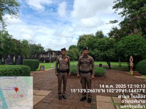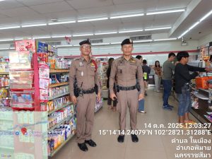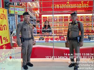 วันที่ 14 ตุลาคม พ.ศ. 2568 เวลา 12.00 – 13.00 น. ภายใต้การอำนวยการของ พ.ต.อ.สิทธิศักดิ์ พรหมหมื่นไวย ผกก.สภ.พิมาย, พ.ต.ท.ประเสริฐ ฟุ้งพิมาย รอง ผกก.ป.สภ.พิมาย มอบหมายให้ พ.ต.ต.พิทยา การสร้าง สวป.สภ.พิมาย พร้อมด้วย ร.ต.อ.พิเชษฐ์ ฉวีกลาง รอง สวป.สภ.พิมาย และเจ้าหน้าที่สายตรวจรถยนต์ ร่วมตรวจตราเพื่อป้องกันปราบปรามอาชญากรรม ธนาคาร/ร้านทอง/ร้านสะดวกซื้อ(7-11)/ปั๊มน้ำมัน ปตท./ห้างสรรพสินค้าฮกกี่เมก้าสโตร์/ตรวจสถานที่ท่องเที่ยว/ลงระบบ Police 4.0
