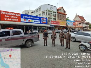 วันที่ 31 มีนาคม พ.ศ. 2568 เวลา 10.30 – 13.30 น. ภายใต้การอำนวยการของ พ.ต.อ.สิทธิศักดิ์ พรหมหมื่นไวย ผกก.สภ.พิมาย, พ.ต.ท.ประเสริฐ ฟุ้งพิมาย รอง ผกก.ป.สภ.พิมาย มอบหมายให้ พ.ต.ต.พิทยา การสร้าง สวป.สภ.พิมาย, ร.ต.อ.สุพรรณโรจน์ อิ่มวิเศษ รอง สวป.สภ.พิมาย (ปฏิบัติหน้าที่ร้อยเวรจราจร) พร้อมด้วยสายตรวจรถยนต์/รถจักรยานยนต์ และสายตรวจจราจร ร่วมตรวจตราเพื่อป้องกันปราบปรามอาชญากรรมในพื้นที่รับผิดชอบ ดังนี้